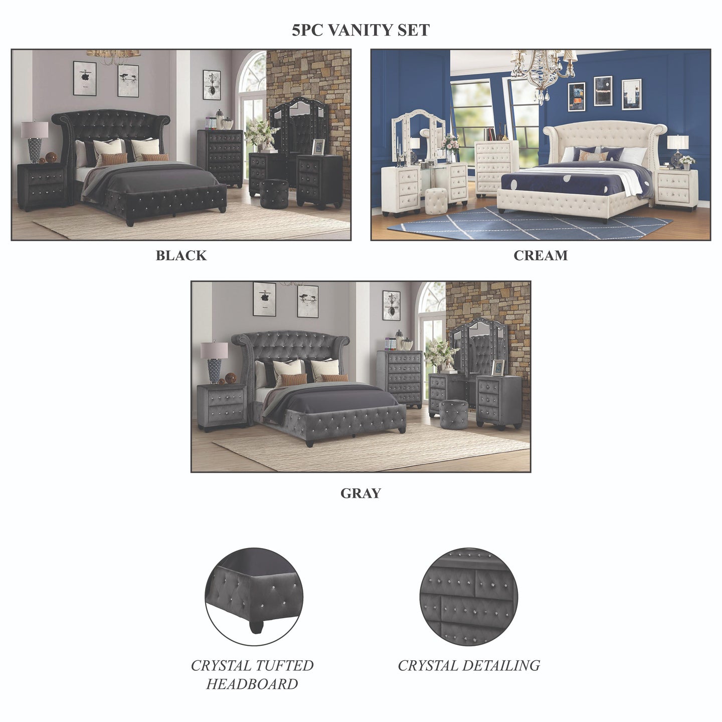 Embrace bold elegance and modern sophistication with this luxurious 5-piece bedroom set, featuring a tufted black velvet bed, dresser, mirror, nightstand, and chest. The grand wingback headboard, adorned with deep diamond tufting and crystal accents, exudes a sense of glamour and refinement. Each piece is designed with matching tufted details and sparkling crystal knobs, creating a cohesive and striking aesthetic. With spacious storage drawers and a durable construction, this set seamlessly combines luxury, comfort, and practicality, making it the perfect addition to any modern or contemporary bedroom.
